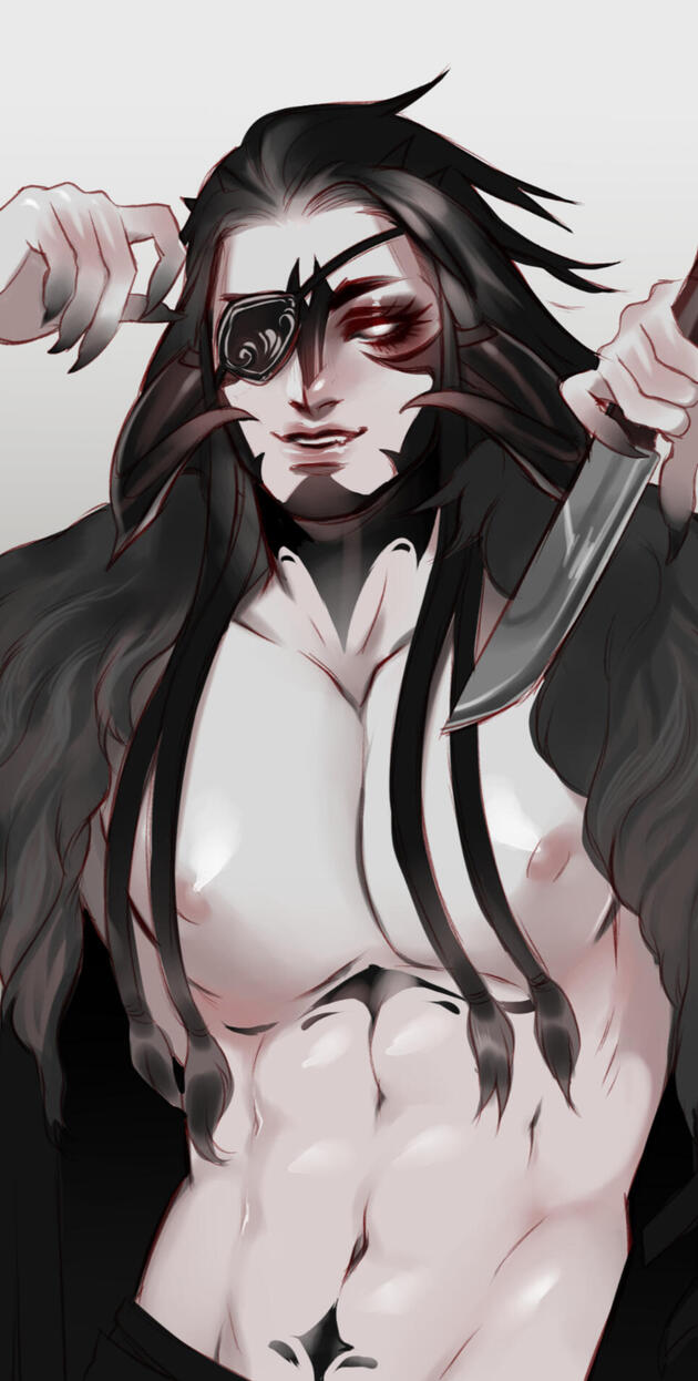 Long raven black hair that comes down to four braids, two at each side. White eyes that seem to pierce through the night and anything lurking within it. Pure white skin. Fingers tipped with long black claws that he keeps pointed. His eyes seemingly glow a striking white when in the dark, growing brighter when he hunts or is focused on something. Lips are stained slightly red from drinking blood.